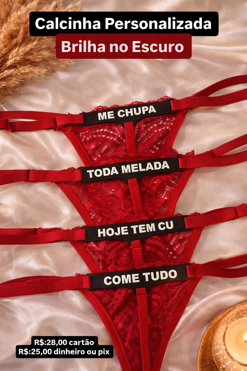 Calcinha Personalizada Frases picantes que brilham no escuro, fabricada em renda de alta qualidade.